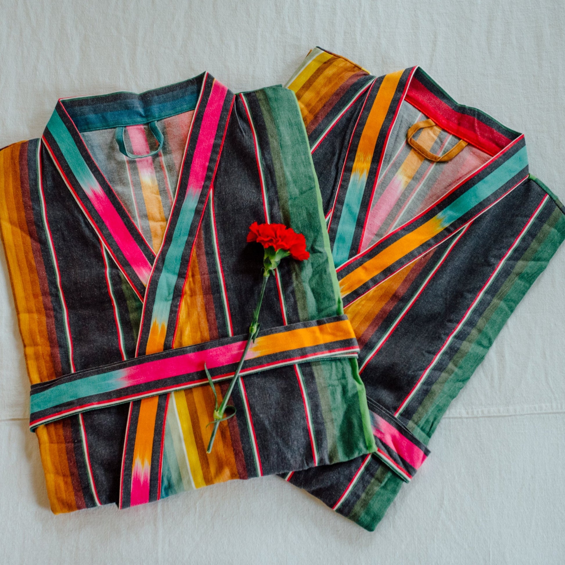 Custom made, super soft, 100% cotton kimono robe with waist ties and pockets. What makes this robe so special are the tie dyed sections, that are gathered and hand dipped in various colors, including magenta, saffron, and turquoise in a specific sequence so you see ripples of color cascading down the fabric.